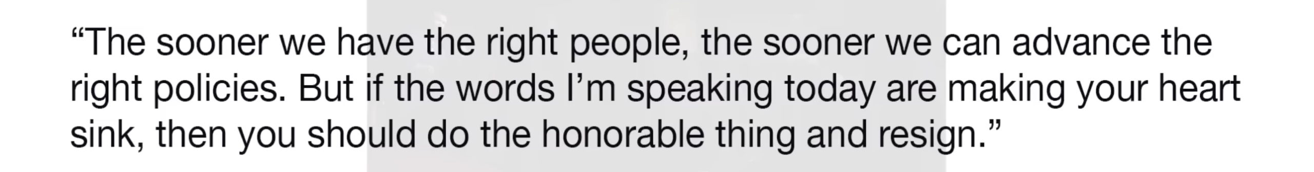 Je frü­her wir die rich­ti­gen Leu­te haben, desto eher kön­nen wir die rich­ti­ge Poli­tik vor­an­trei­ben. Aber wenn die Wor­te, die ich heu­te spre­che, Ihnen das Herz bre­chen, dann soll­ten Sie das Ehren­haf­te tun und zurücktreten.