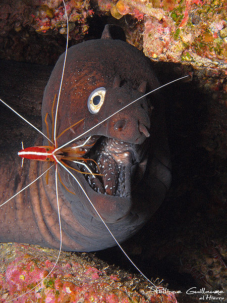 Der als "moray eel" (zu Deutsch: Muräne) bezeichnete Fisch hat eine tief im Schlund liegende Struktur, die eine Art "zweites Gebiß" darstellt - der äußere Kiefer dient nur dem Festhalten der Beute, das Packen & herunterschlucken wird von dem "Pharyngeal-Gebiß" erledigt .... der Vergleich mit dem Biß des Monsters aus "ALIEN" zeigt frappante Ähnlichkeit: