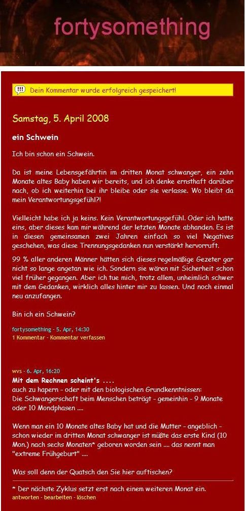 Herr 40something, bitte nur auf meine Kommentare antworten, wenn Sie sich darauf beziehen. Ich bin sehr sensibel und habe mich schon ganz entsetzt gefragt, wieso ich bei Ihnen kommentiere. Aber was nicht ist, kann ja noch werden. Sie sind anscheinend wild entschlossen. Weiter so!