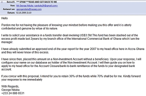 ALLE bekom­men immer die­se *SPAM*-Mails mit Ange­bo­ten aus Nige­ria, Gha­na oder son­sti­gen afri­ka­ni­schen Staa­ten - nun, end­lich, wur­de ich auch 'mal bedacht ....