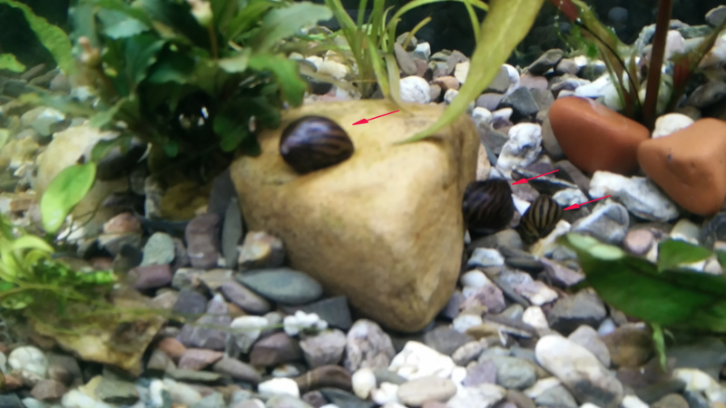 Einstweilen sind drei Schnecken (rote Pfeile, Zebra-Rennschnecke [Neritina natalensis]) im Aquarium, sie sollen die aufkommenden Algen (schon nach dieser kurzen Phase bedecken sie die Scheiben von innen!) vertilgen.