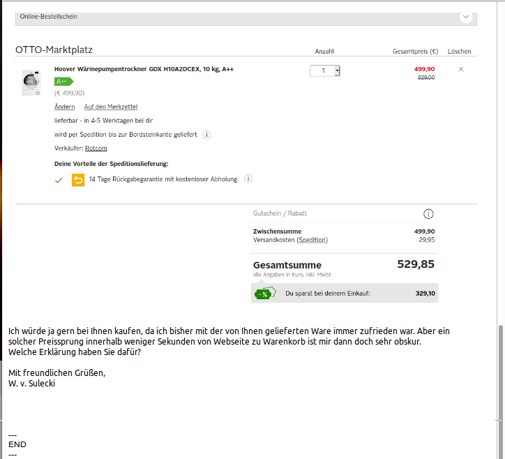 2. War in der Erst­fas­sung eigent­lich kein Erspar­nis­be­trag ange­ge­ben? Ich neh­me an, dass in dem Kauf­for­mu­lar die Anga­be die­ses doch sehr hohen Erspar­nis­be­trags von 329,10€ der Kun­de [unver­schäm­ter­wei­se mal wie­der geduzt] letzt­lich gekö­dert wer­den soll, den Arti­kel trotz der Erhö­hung zu kau­fen. Was inter­es­sie­ren den einen oder ande­ren denn die 100 Euro, wenn er immer noch 329,10 Euro spart - gegen­über was eigent­lich? Schon klar, gegen­über der "unver­bind­li­chen Preis­emp­feh­lung" des Her­stel­lers, die, wie bekannt, schon extrem über­höht ist.