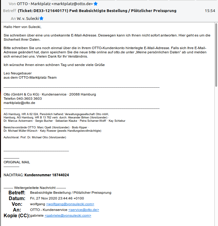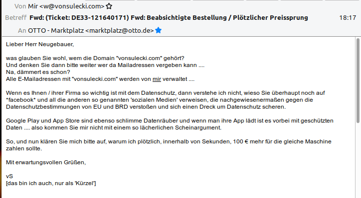 Nun bin ich sehr gespannt, was ich als Ant­wort von OTTO ins Post­fach bekomme.