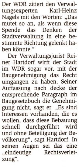 Denn der WDR hat 'aus­ge­gra­ben', daß just jene Far­ben­fir­ma - die Bau­her­rin - vor Ertei­lung der Bau­ge­neh­mi­gung der Stadt eine Sum­me von € 200.000,- für die Sanie­rung der Stadt­bü­che­rei 'gespen­det' hat: