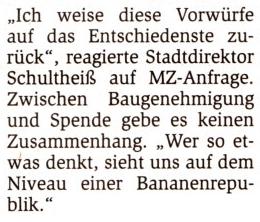 Natür­lich strei­ten sowohl die Stadt als auch die Fir­ma jeden Zusam­men­hang zwi­schen der Spen­de und der Bau­ge­neh­mi­gung ab, vehement!