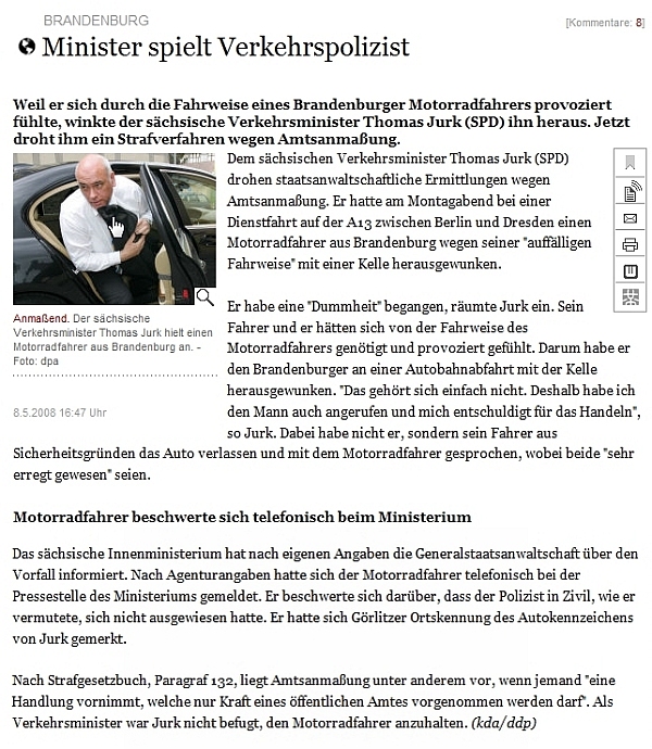 Ich habe eine Quel­le gefun­den, die über den Vor­fall mit dem Motor­rad­fah­rer berich­tet - 'mal sehen, ob die auch ganz plötz­lich "ver­schwin­det" .... zur Sicher­heit habe ich eine loka­le Kopie gemacht.