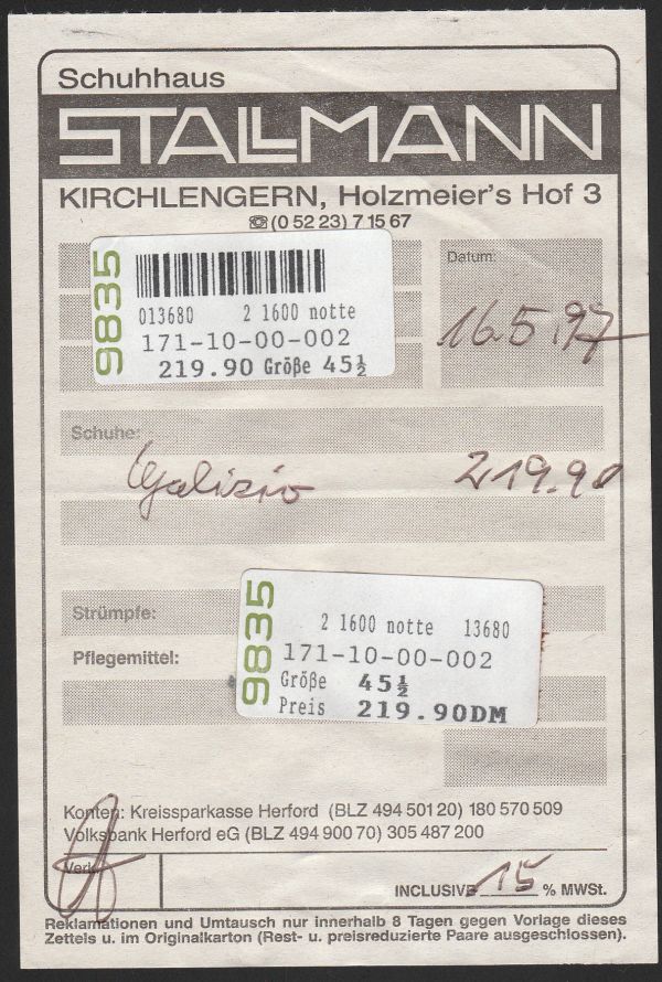 Da koste­te ein paar ita­lie­ni­sche Her­ren­schu­he, hand­ge­näht und mit Leder­soh­le DM219,90 .... das wären umge­rech­net so ca. €112,43 .... Vor ein paar Tagen habe ich - spa­ßes­hal­ber, denn ich bin mit Schu­hen gut aus­ge­stat­tet - 'mal nach­ge­se­hen, was die glei­chen Schu­he heu­te kosten: