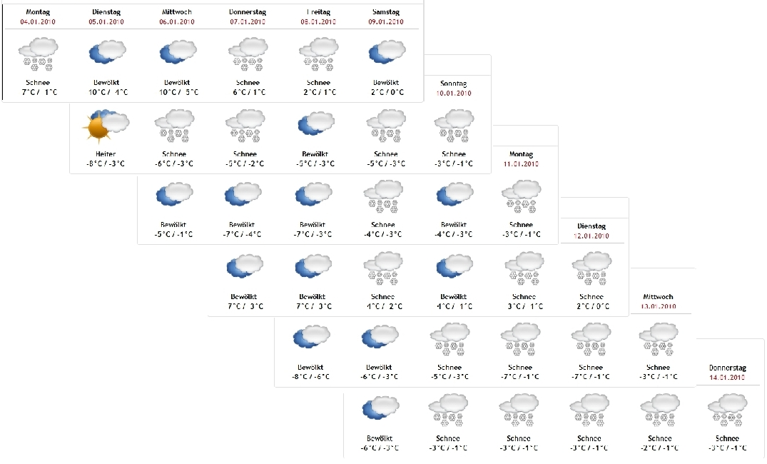 [Wetterdaten von daswetter.org; Älteste Vorhersage oben, jüngste unten, senkrecht stehen gleiche Vorhersagetage übereinander.]
