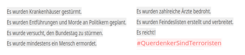 1. Die­sen Text fand ich kürz­lich bei twit­ter - und er schließt eben­falls bestimm­te 'Anlie­gen' der Demon­stran­ten noch nicht ein. Daß sie die The­men erwei­tern ist Kal­kül, denn die Anfüh­rer und Agi­ta­to­ren wol­len doch ihre Macht nicht verlieren.
