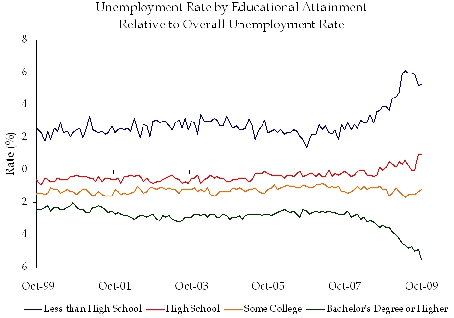 Daß es sich lohnt einen Schulabschluß zu haben ist bestimmt unstrittig - daß aber zudem ein höherer Bildungsabschluß zwar nicht vor Arbeitslosigkeit schützt, deren Eintrittswahrscheinlichkeit aber minimiert zeigt die folgende Abbildung aus U.S.A. ....